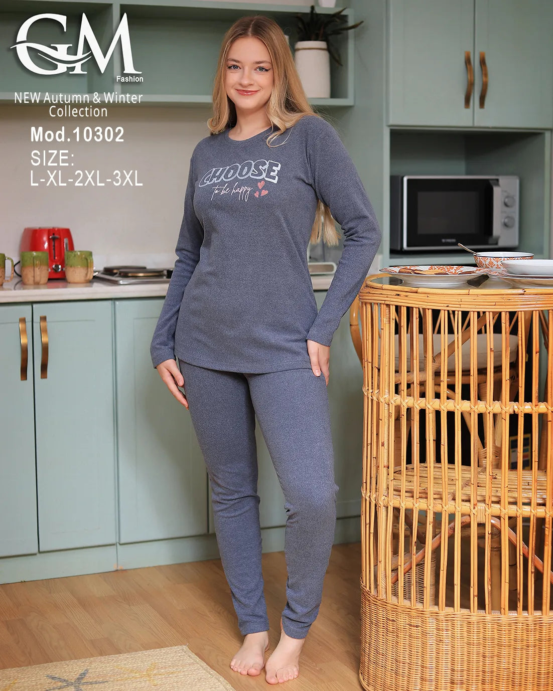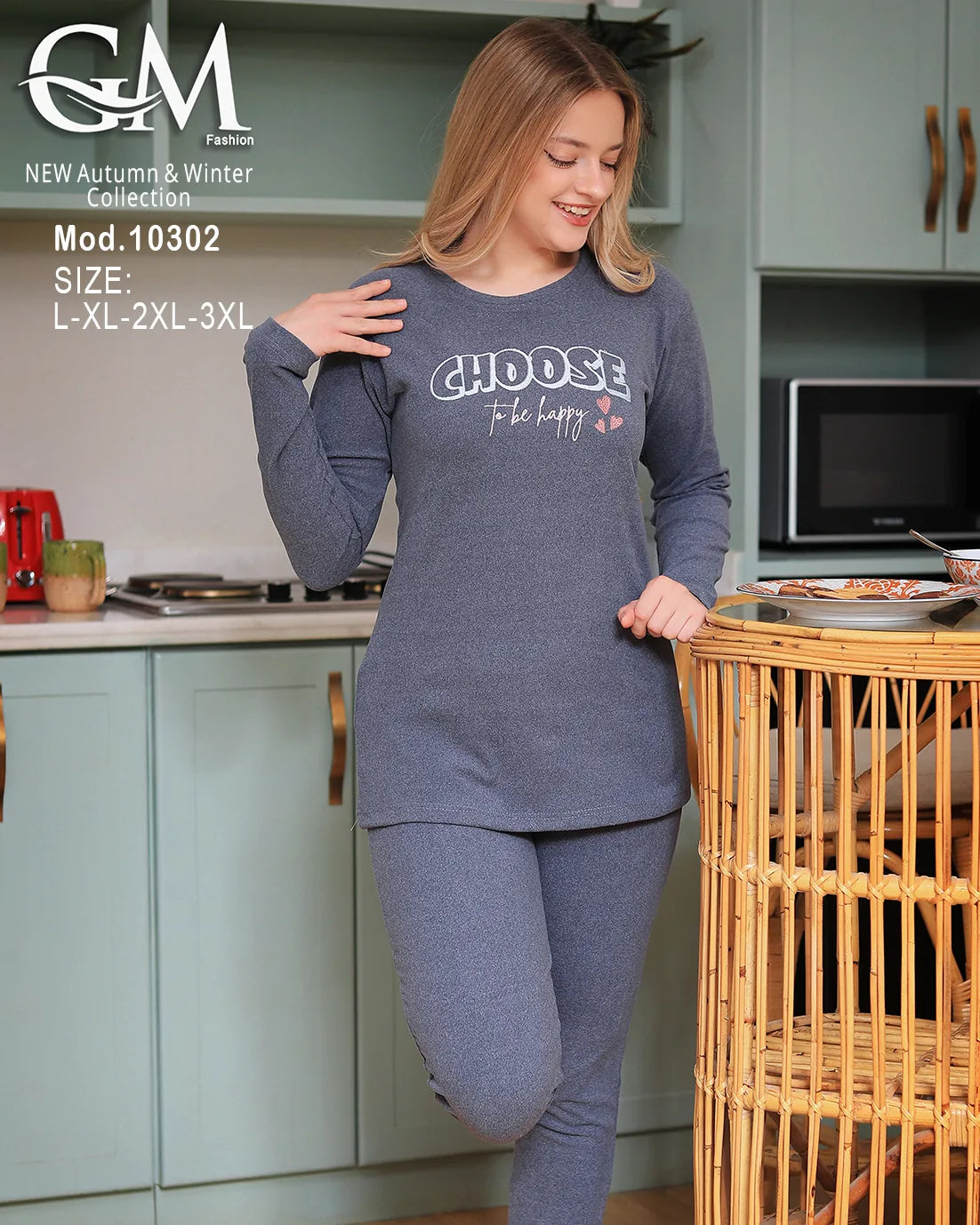 استمتعي بلمسة من الإيجابية والراحة مع طقم البيجامة الشتوي الأنيق من GM Fashion. يتميز الموديل 10302 بطبعة "CHOOSE to be happy" التي تضفي عليه لمسة مميزة. الطقم مصنوع من خامة دافئة وناعمة، ومناسب تماماً لأجواء الخريف والشتاء. يتكون من بلوزة بأكمام طويلة وبنطلون طويل، وهو متوفر بألوان عصرية ومقاسات من L إلى 3XL.