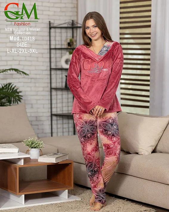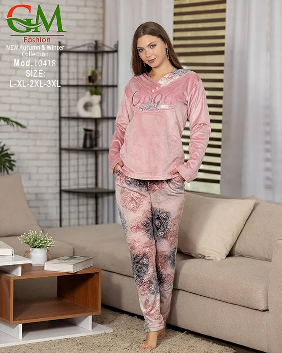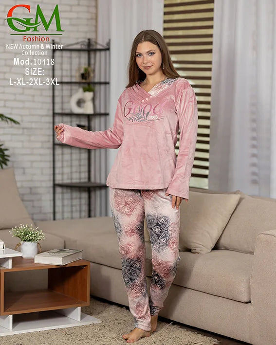 بيجامة حريمي قطيفة منقوشة GM Fashion | موديل 10418 بيجامات شتوي تقيلة برسومات