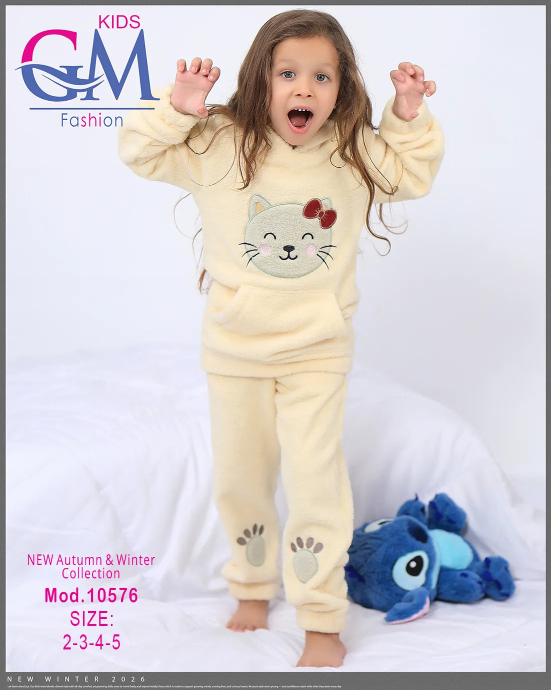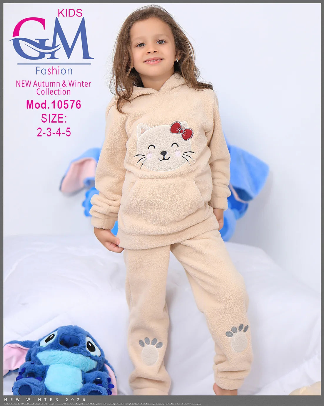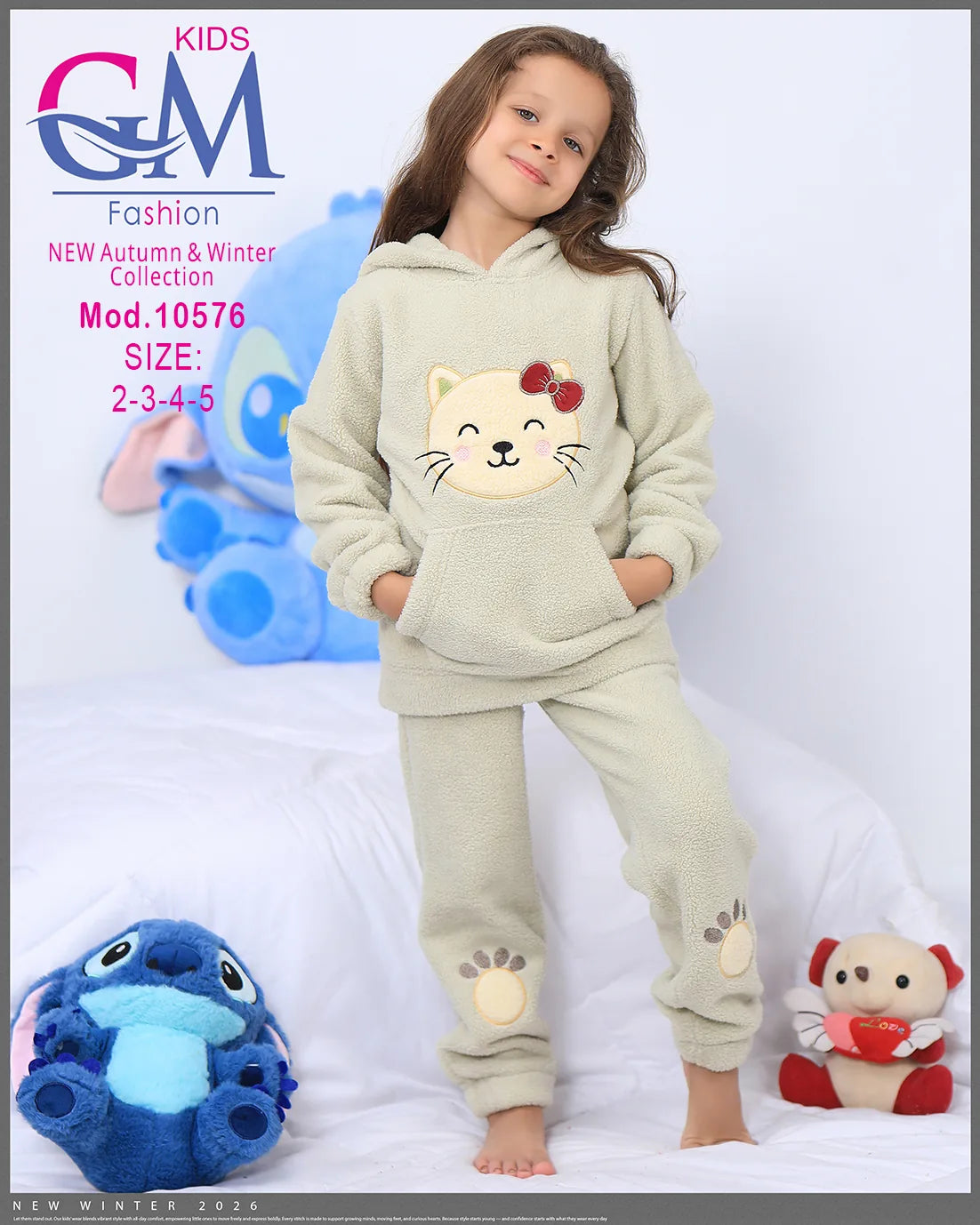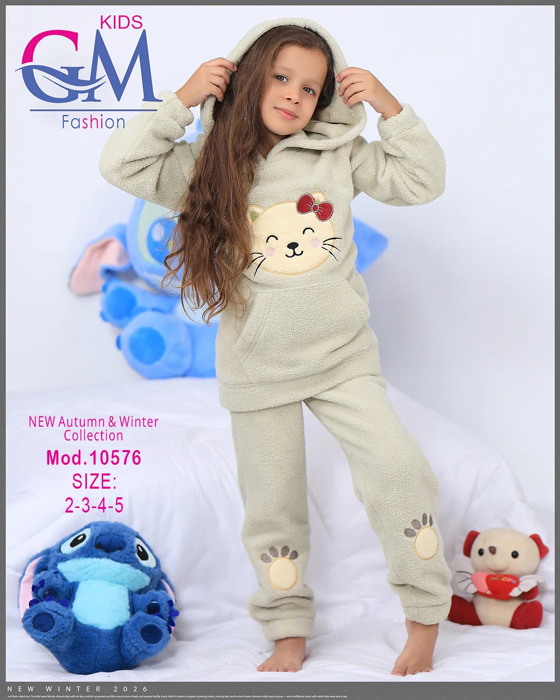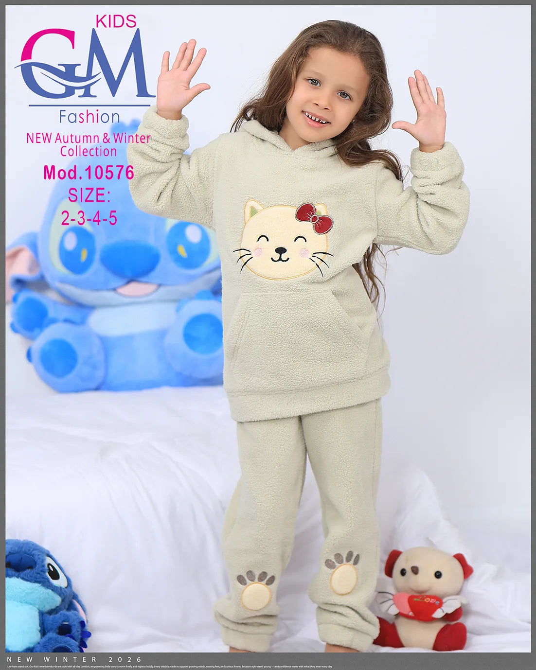 طقم شتوي بناتي مميز من GM Kids مصنوع من فرو ناعم دافئ، تصميم عملي بكابيشون وحفره جيب أمامي برسمة وجه قطة لطيفة وطبعة كفوف على البنطلون. مناسب للبيت والخروج في الشتاء ويوفر راحة ودفء للأطفال. متوفر بعدة ألوان جذابة تناسب ذوق البنات الصغيرات.