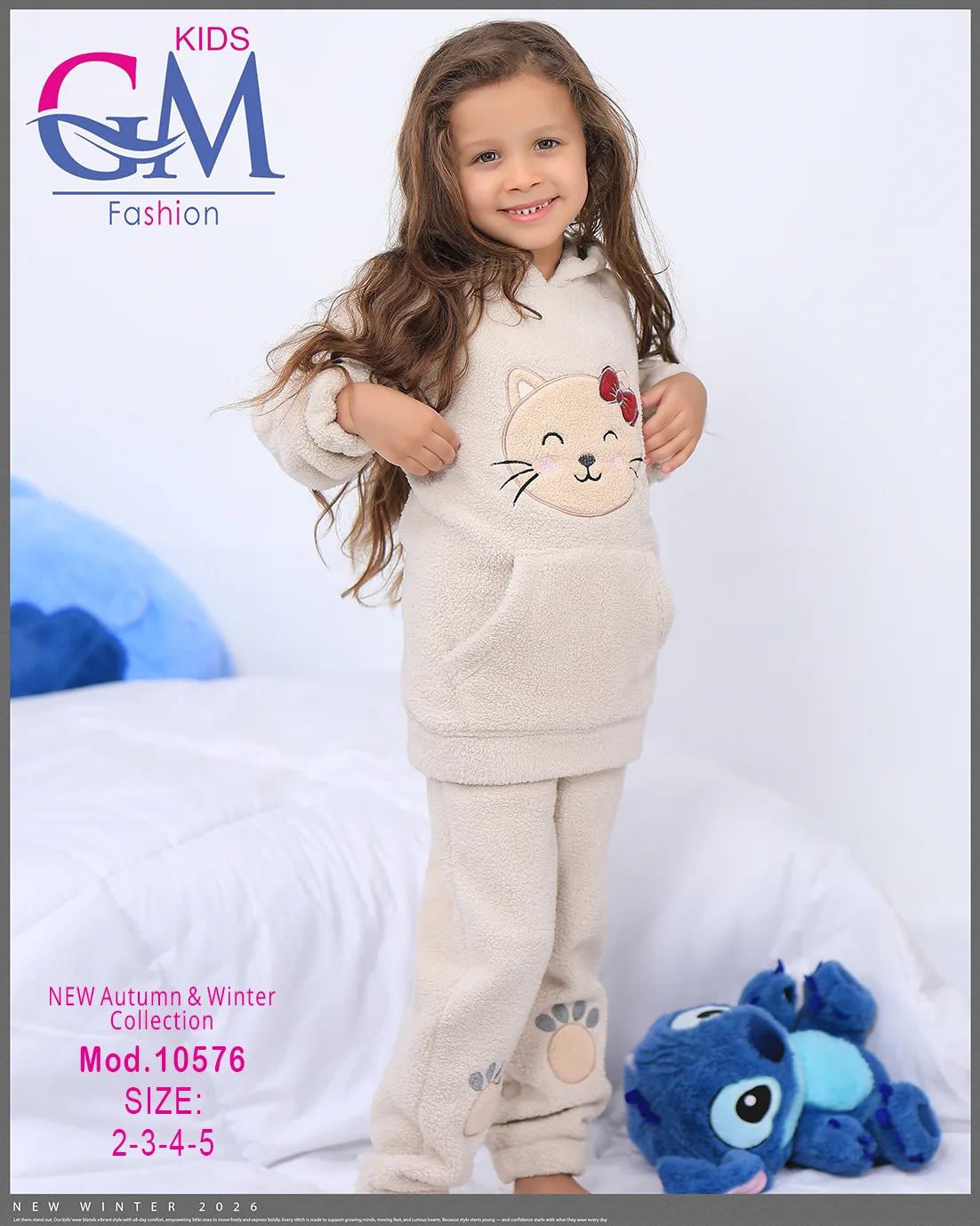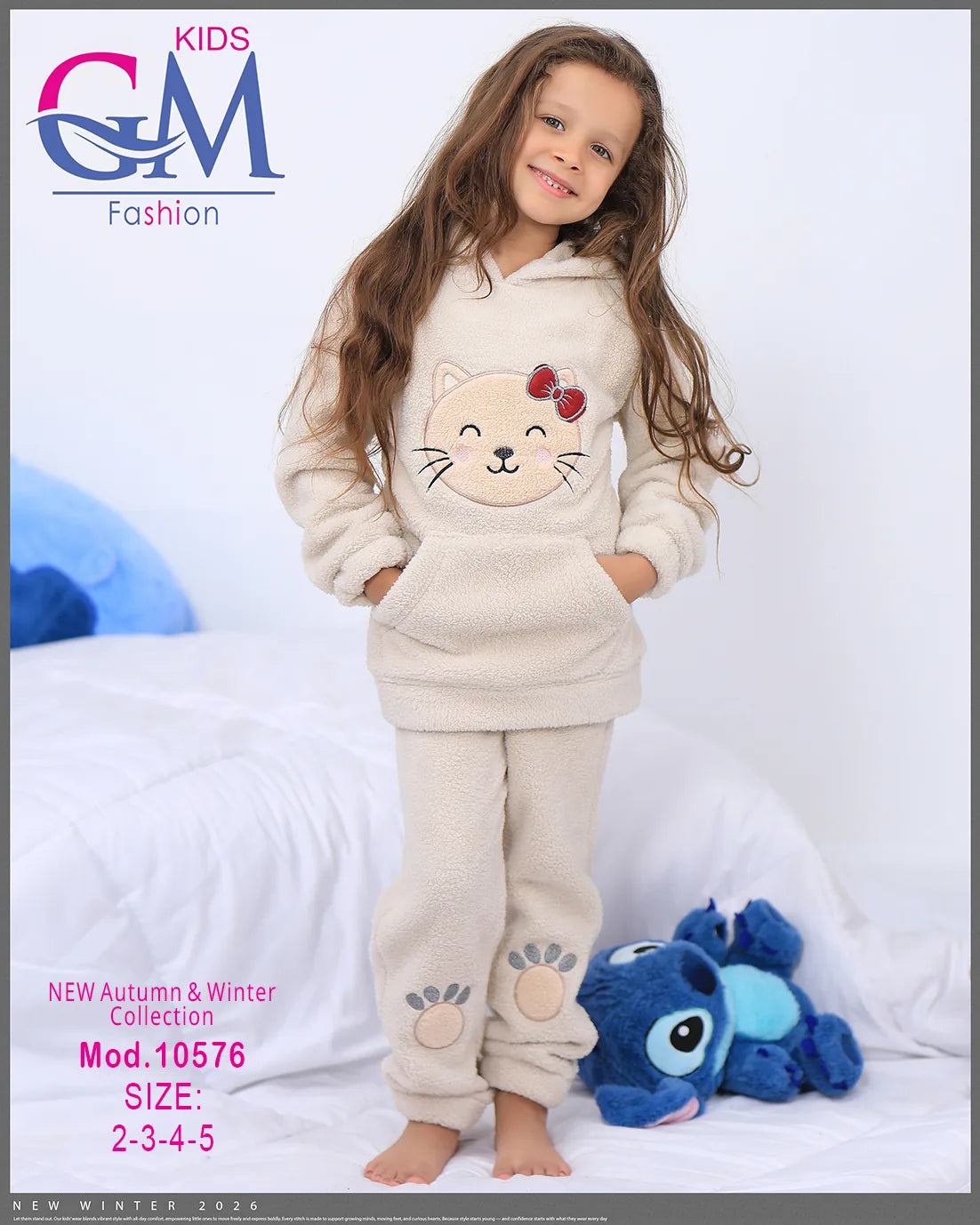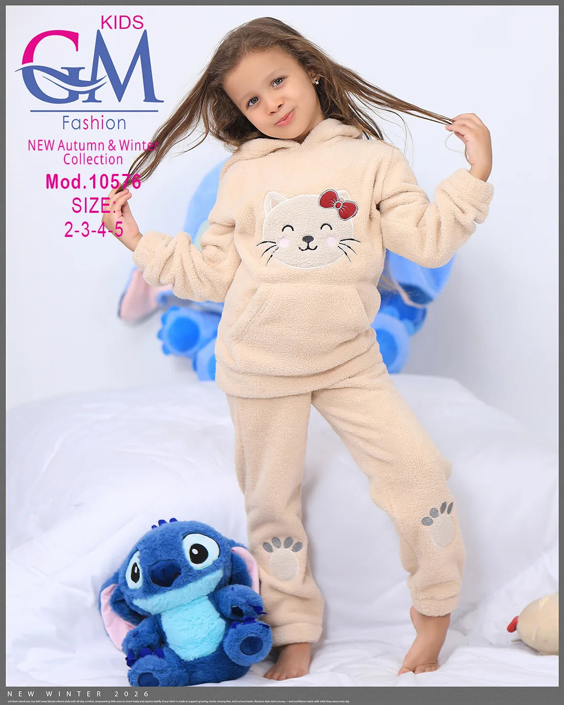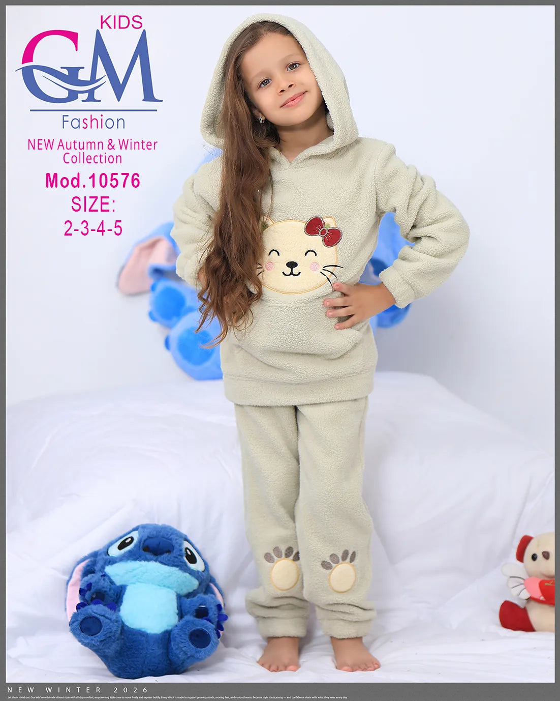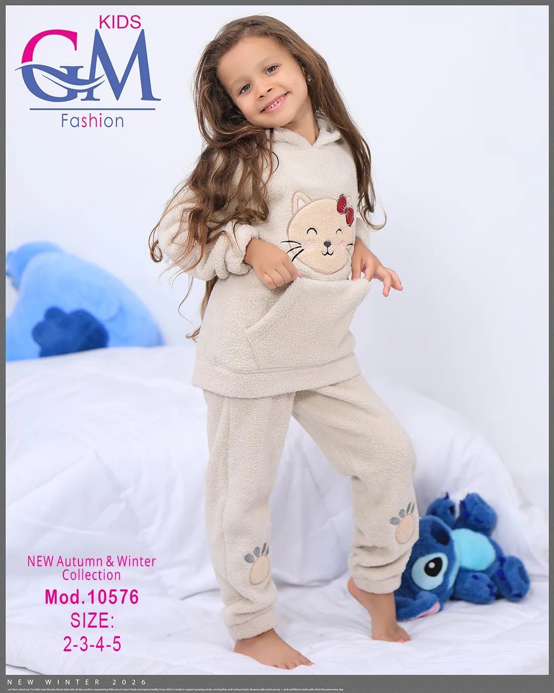 طقم شتوي بناتي مميز من GM Kids مصنوع من فرو ناعم دافئ، تصميم عملي بكابيشون وحفره جيب أمامي برسمة وجه قطة لطيفة وطبعة كفوف على البنطلون. مناسب للبيت والخروج في الشتاء ويوفر راحة ودفء للأطفال. متوفر بعدة ألوان جذابة تناسب ذوق البنات الصغيرات.