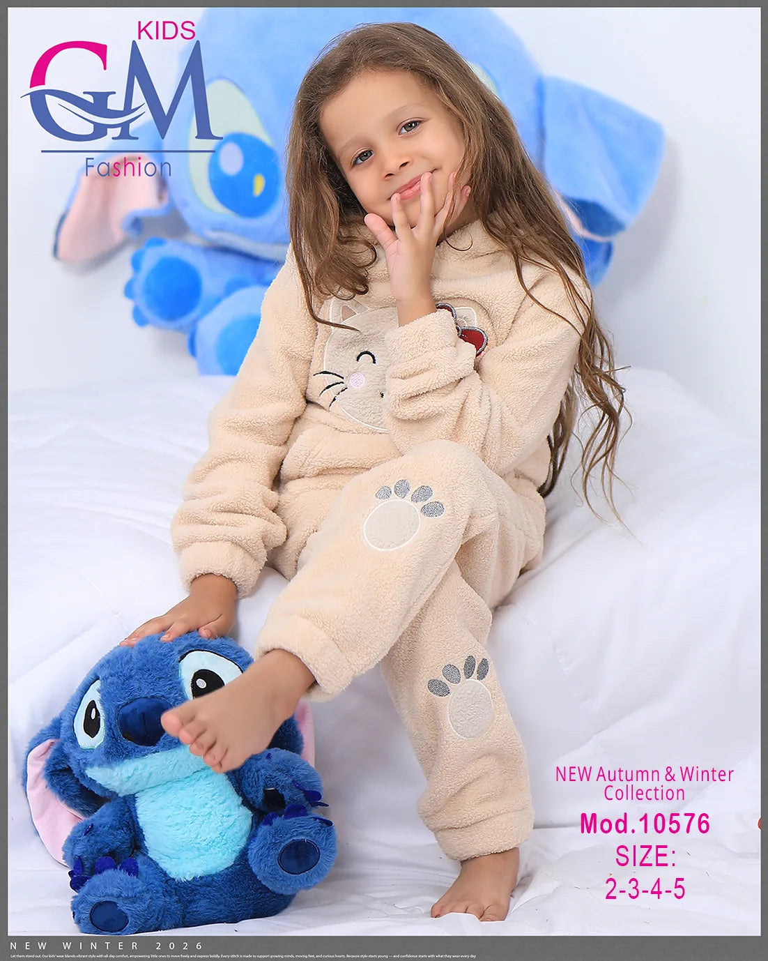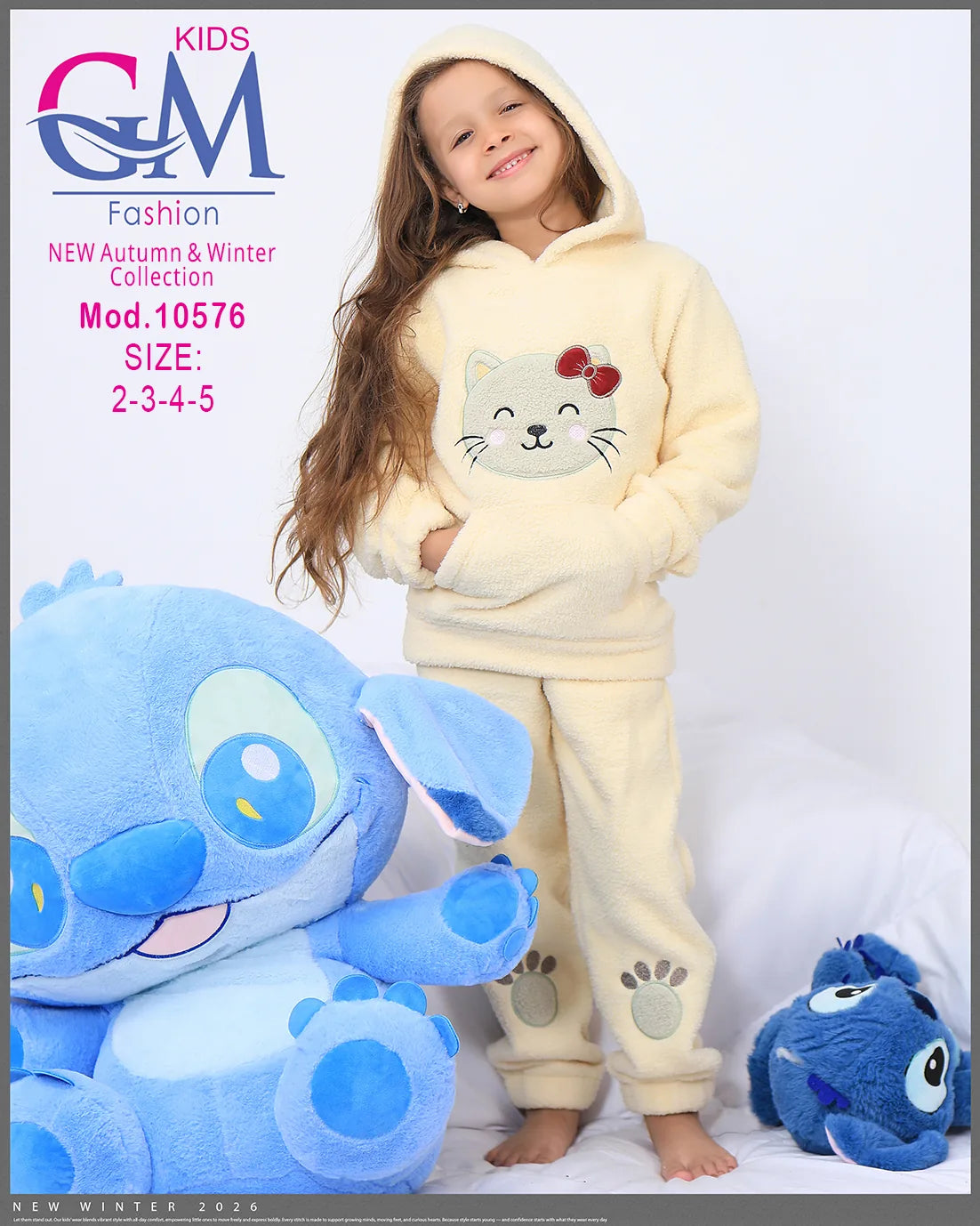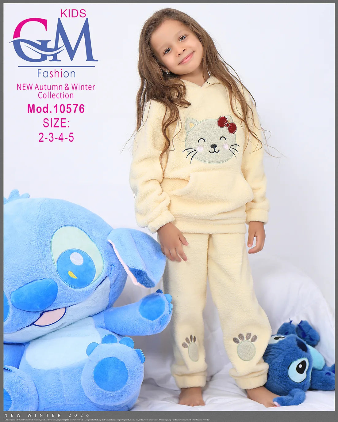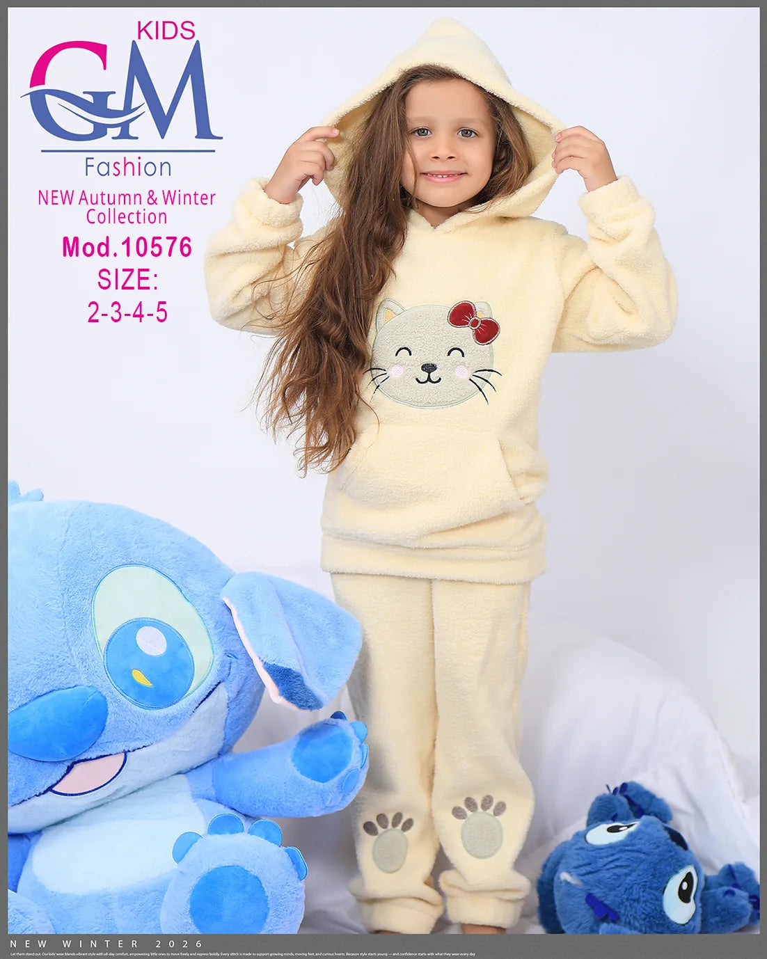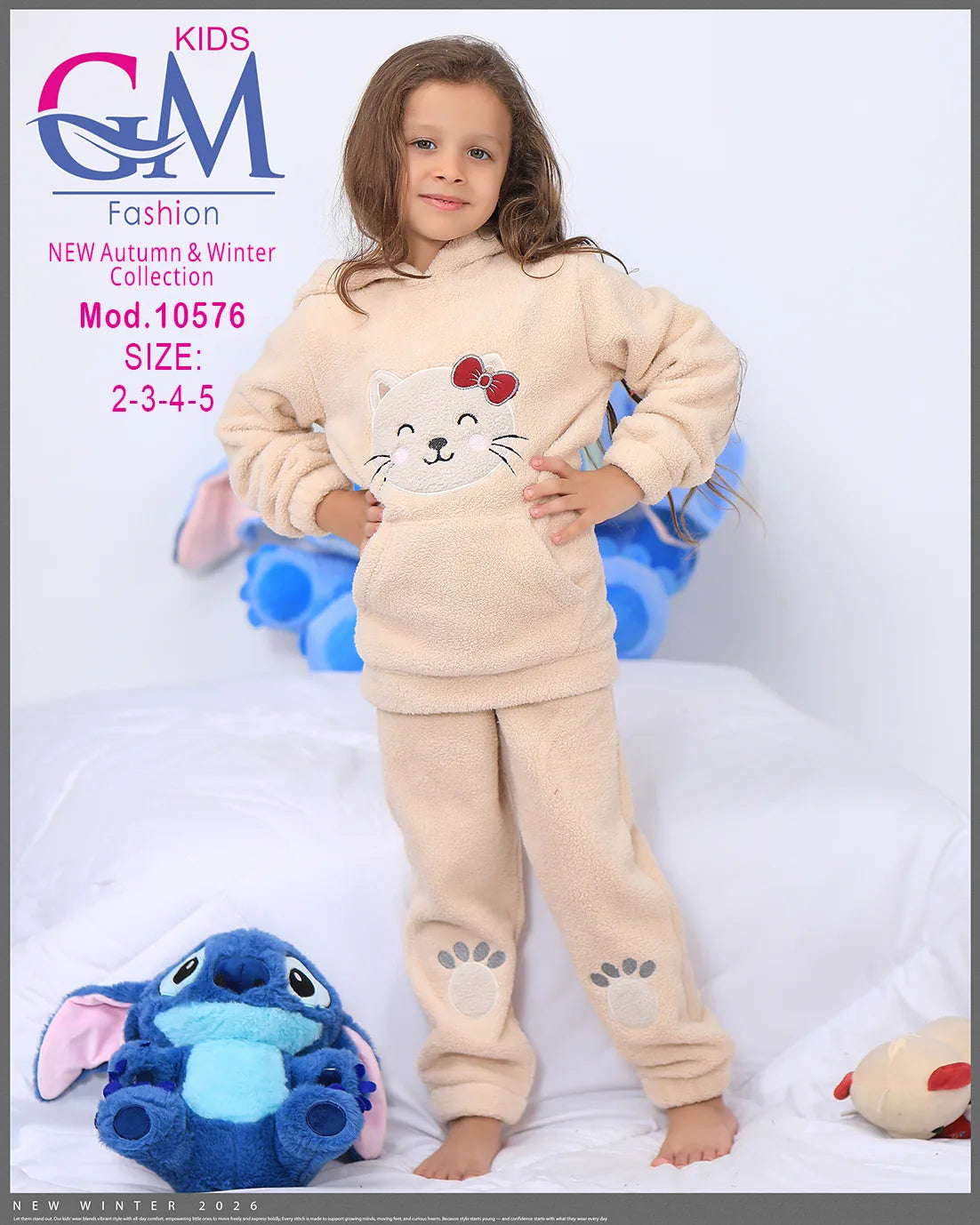 طقم شتوي بناتي مميز من GM Kids مصنوع من فرو ناعم دافئ، تصميم عملي بكابيشون وحفره جيب أمامي برسمة وجه قطة لطيفة وطبعة كفوف على البنطلون. مناسب للبيت والخروج في الشتاء ويوفر راحة ودفء للأطفال. متوفر بعدة ألوان جذابة تناسب ذوق البنات الصغيرات.