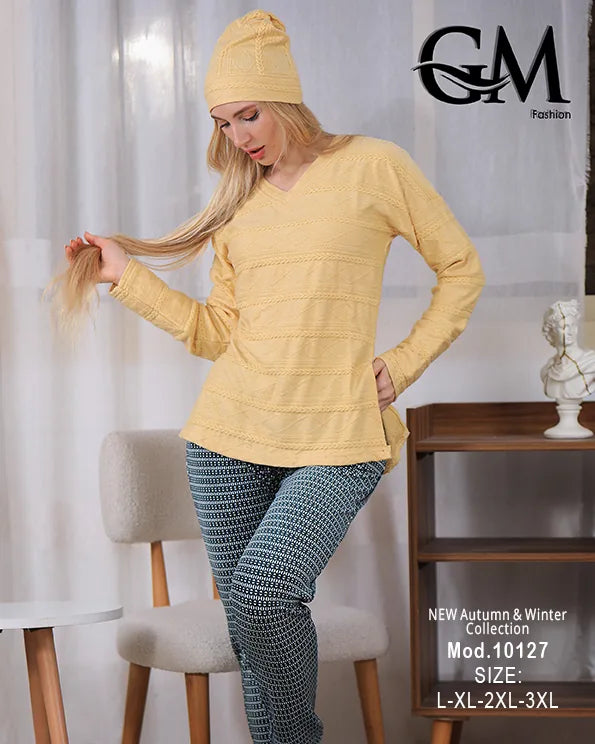 تألقي في البيت مع بيجامة شتوي أنيقة من GM Fashion موديل 10127. مصنوعة من خامة قطيفة ناعمة ودافئة، بتصميم عملي مع توب بأكمام طويلة وقبعة عصرية تضيف لمسة مميزة. بنطلون مريح بنقشة جذابة ليمنحك إطلالة مميزة ومناسبة لفصل الشتاء. مثالية للراحة اليومية مع الحفاظ على الأناقة.