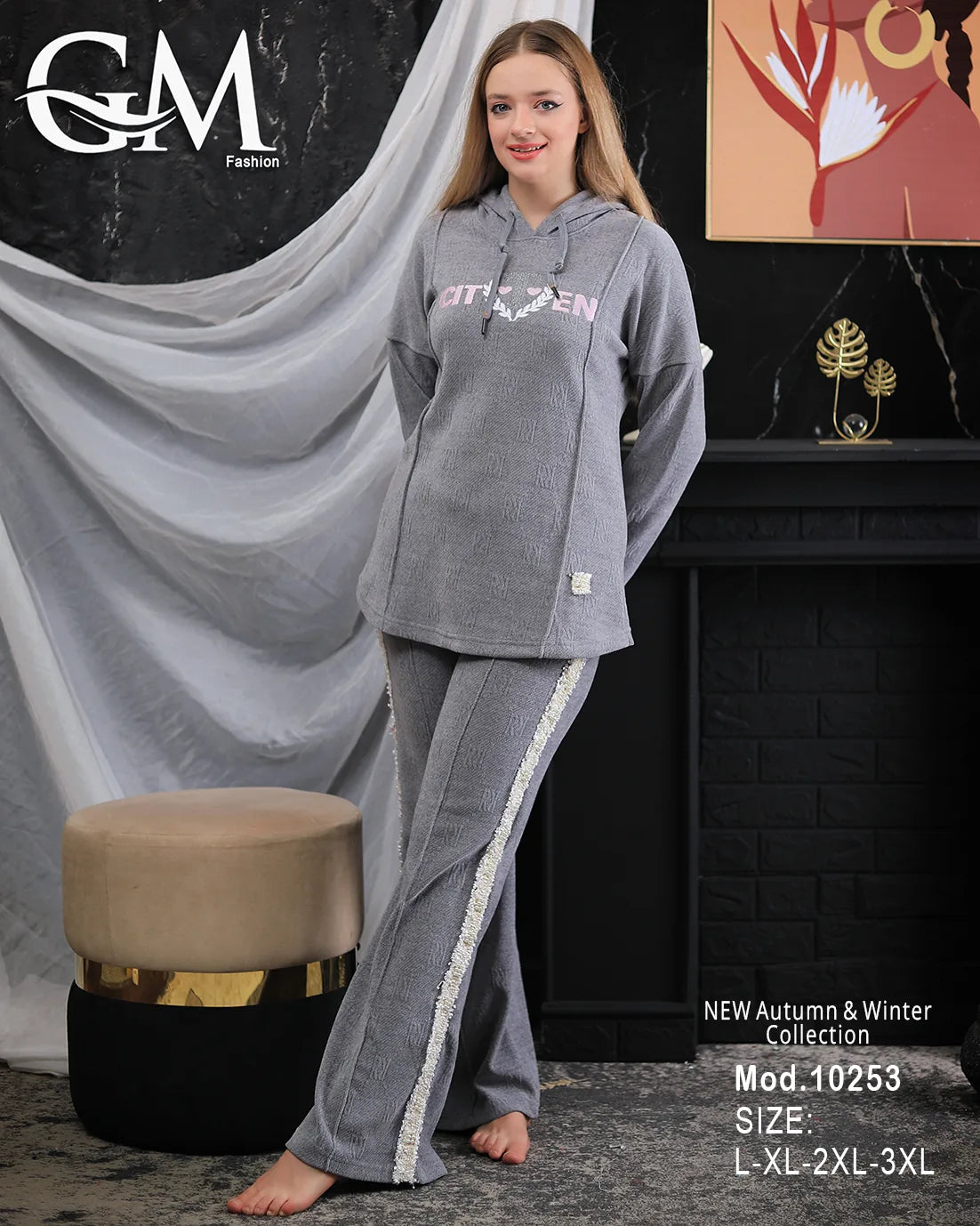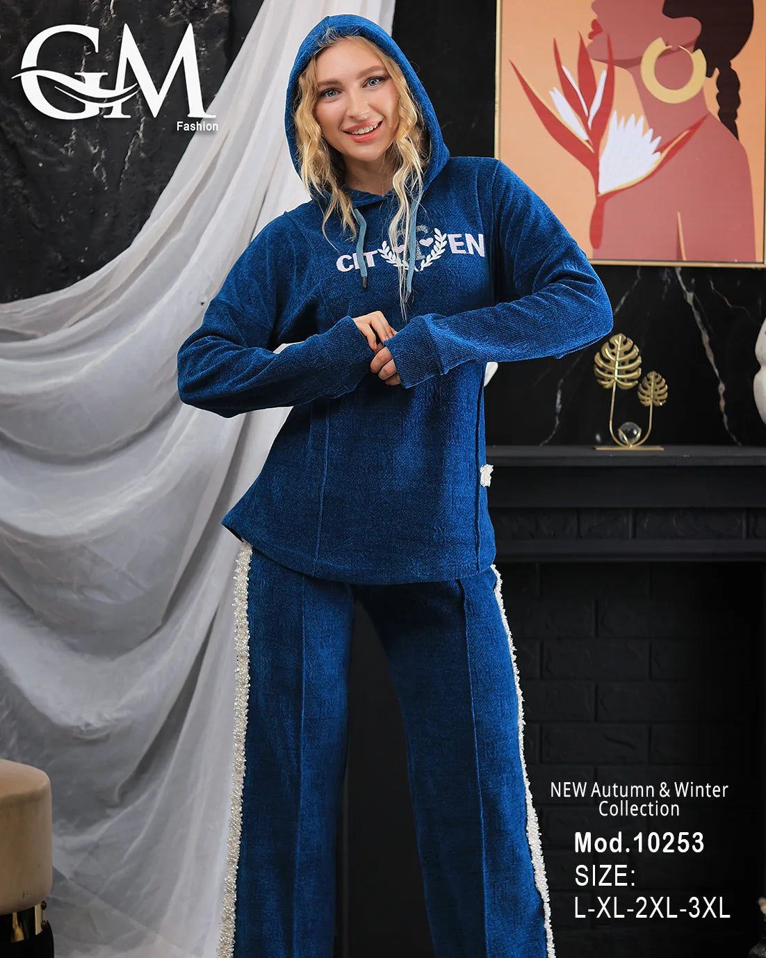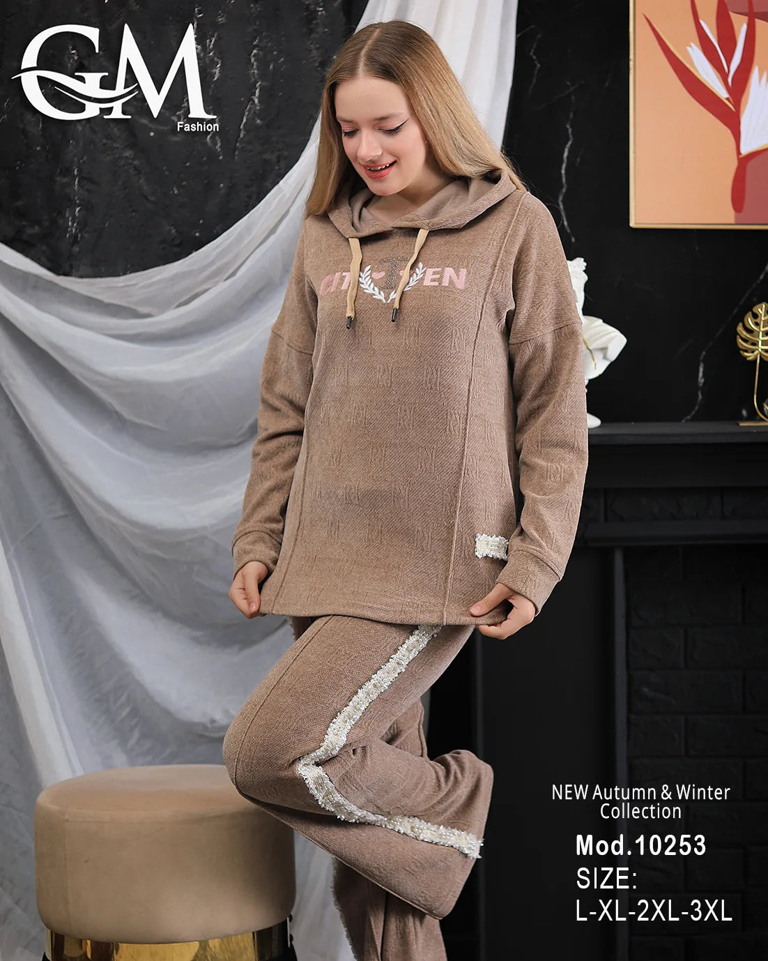 طقم شتوي أنيق من GM Fashion، مصنوع من قطيفة ناعمة مريحة للارتداء اليومي في البيت. يتميز بتطريز ترتر لامع على جانبي البنطلون لإطلالة عصرية. الطقم مكون من هودي بغطاء رأس وبنطلون واسع لراحة تامة.