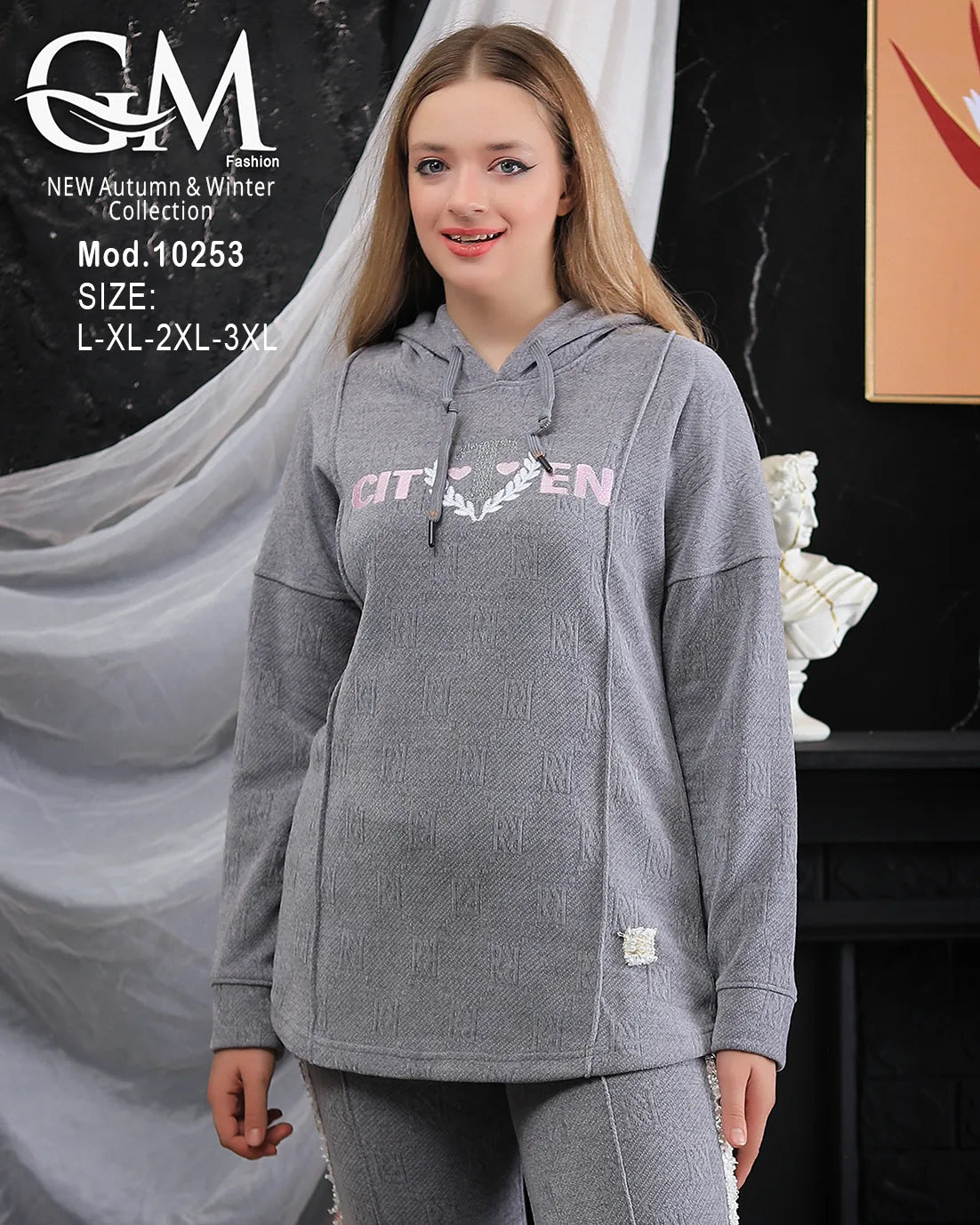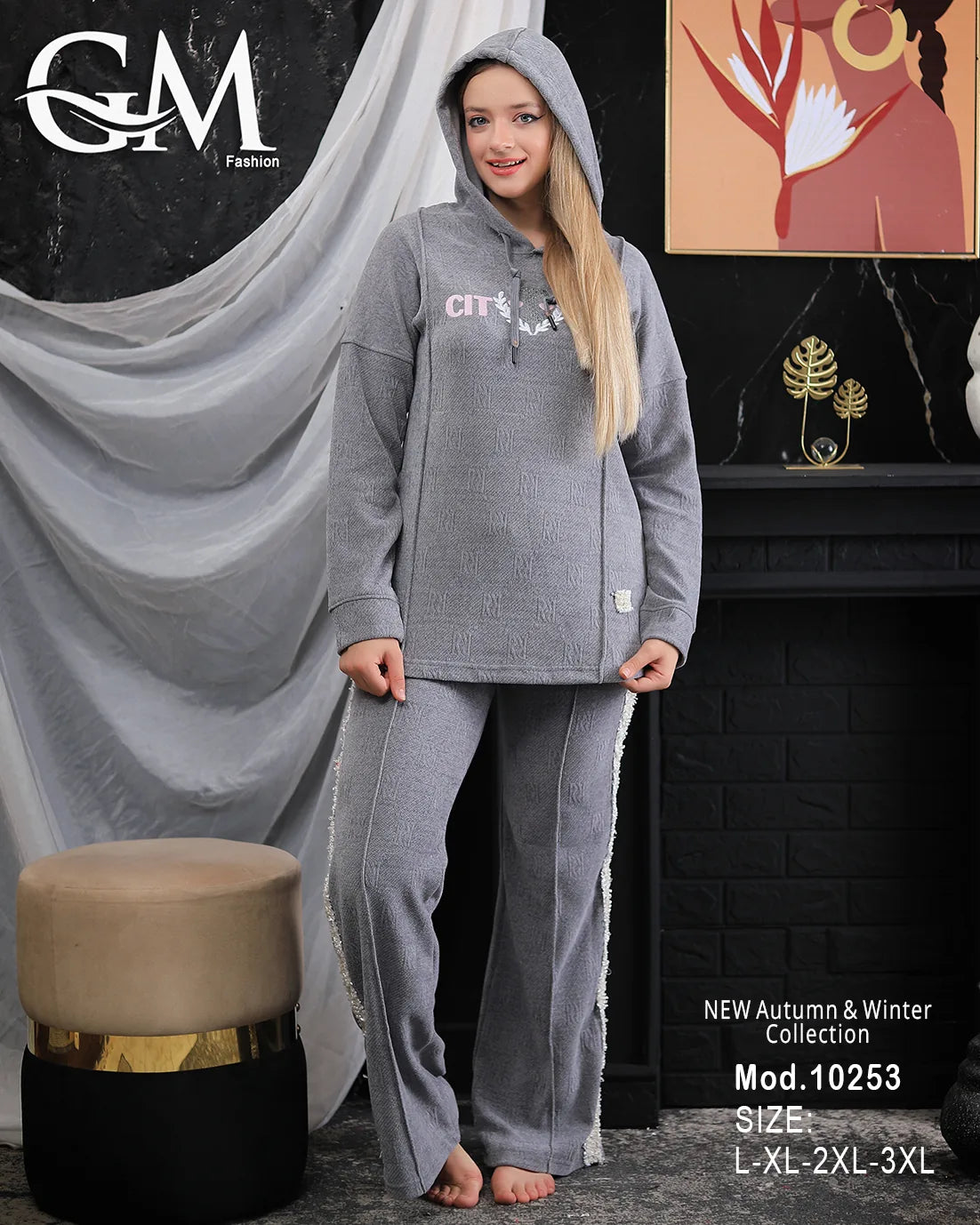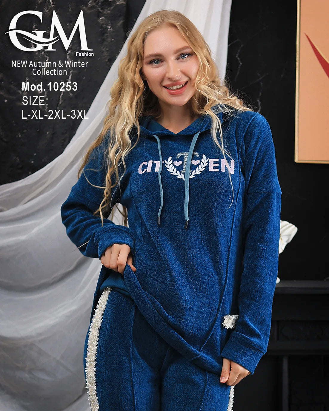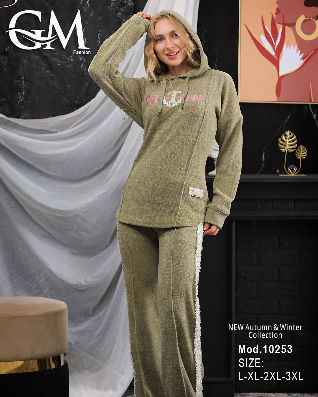 طقم شتوي أنيق من GM Fashion، مصنوع من قطيفة ناعمة مريحة للارتداء اليومي في البيت. يتميز بتطريز ترتر لامع على جانبي البنطلون لإطلالة عصرية. الطقم مكون من هودي بغطاء رأس وبنطلون واسع لراحة تامة.