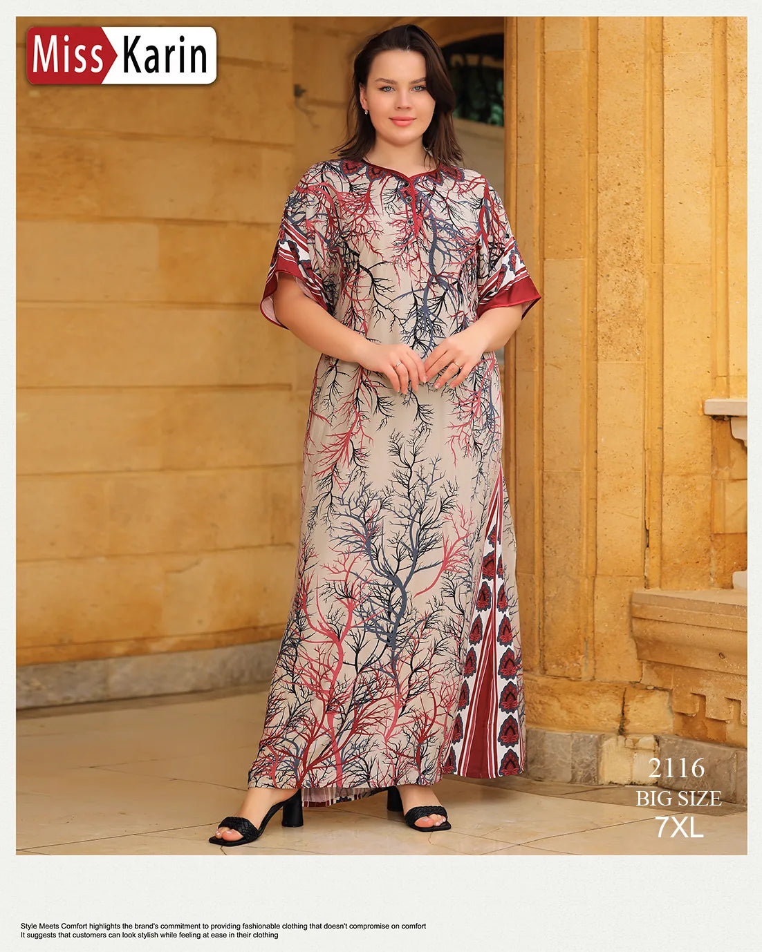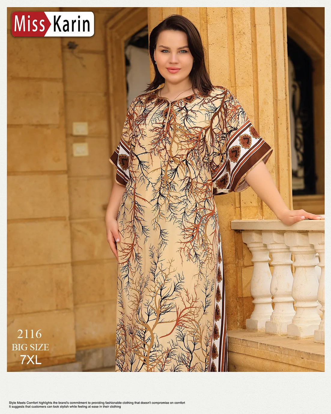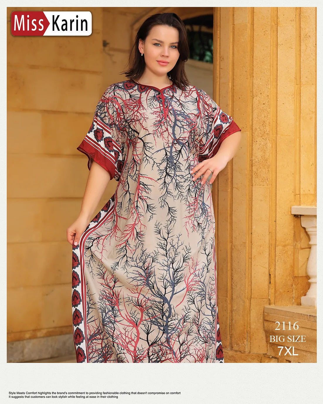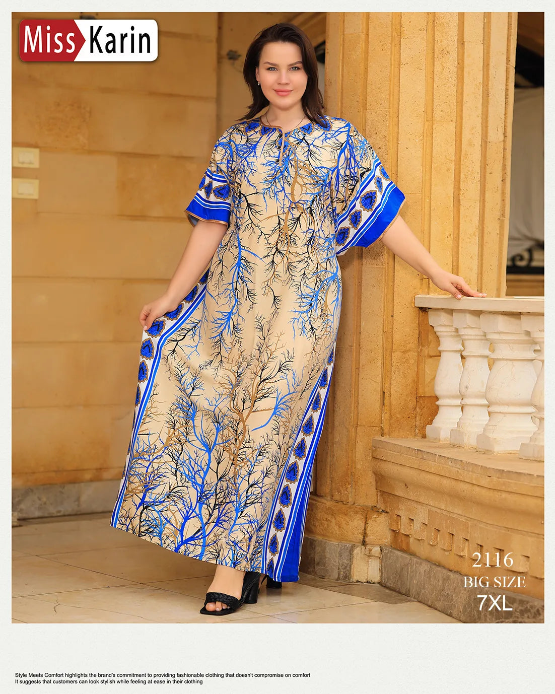لو بتحبي الشكل الشرقي الأنيق مع بارد، جلابية موديل 2116 من Miss Karin هتكون أنسب اختيار ليكي:تصميم عصري بطابعة عربي مشجر وملفت.أكمام واسعة جدًا لحرية حركة واحة طول اليوم.الخامة حتىة، تقدم للبيت والاستقبال.المقاس واسع النطاق، ومناسب لمقاسات كبيرة آخر 7XL. في البيت مع جلابية 2116 من الآنسة كارين، وعيشي بارد والشياكة في كل وقت.