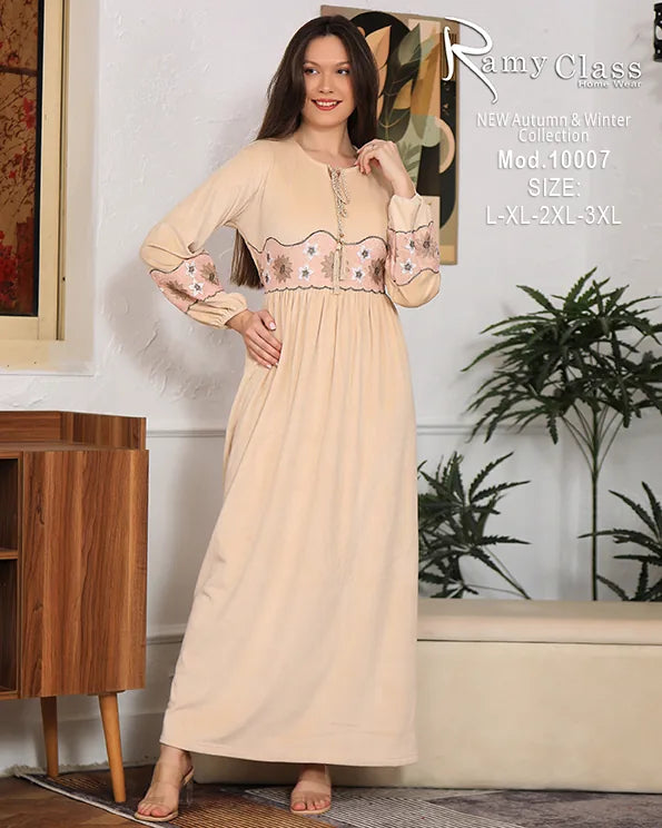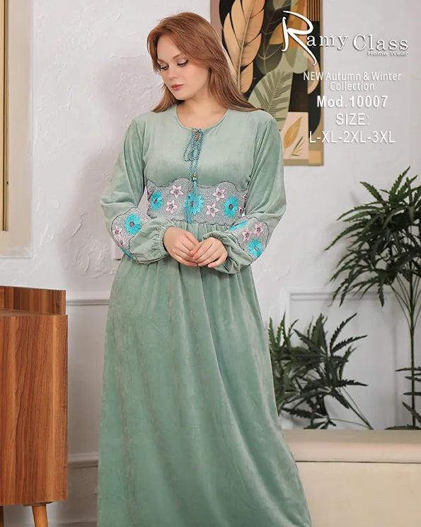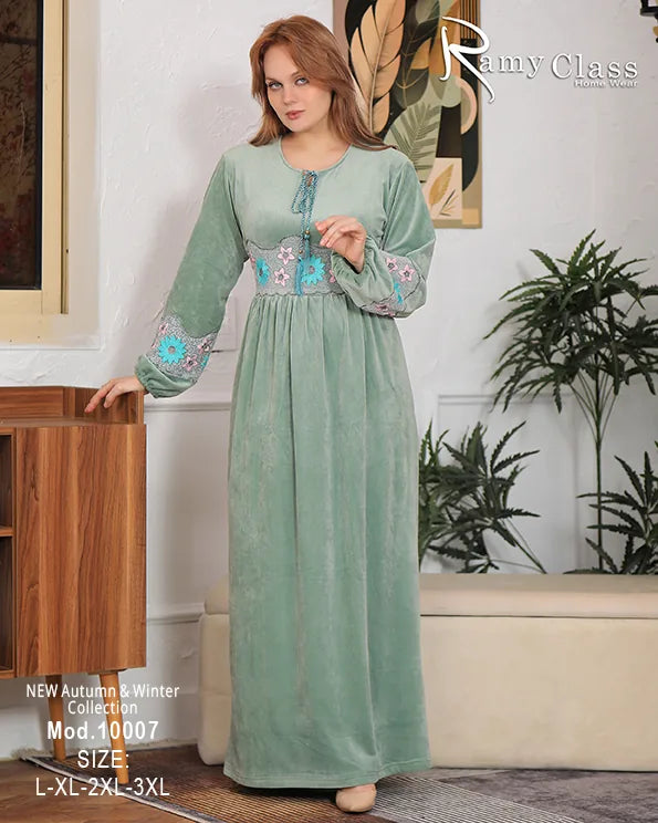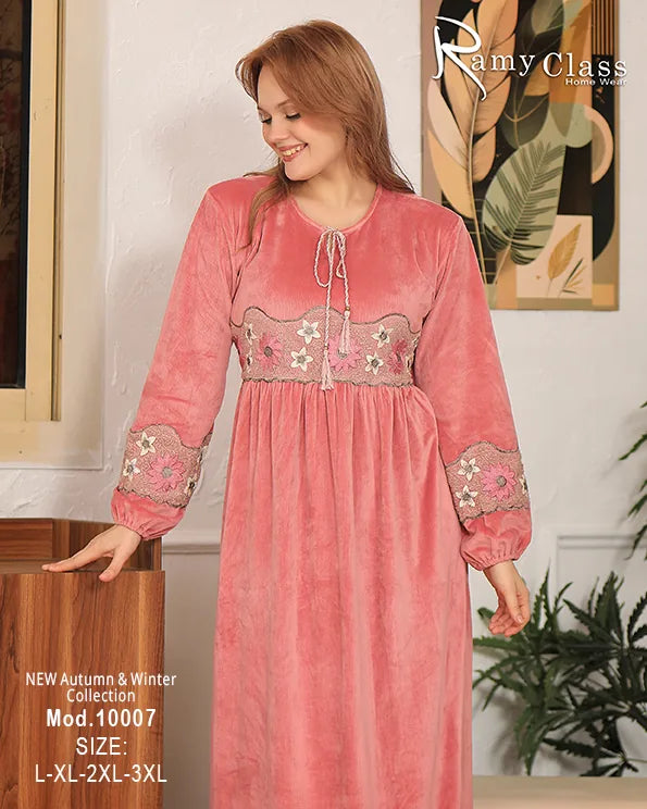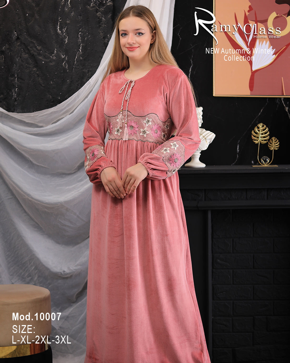 أضيفي لمسة من الفخامة والأناقة إلى ملابسك المنزلية مع عباءة Ramy Class Home Wear، موديل 10007. مصممة من قماش المخمل الناعم، وتتميز بقصة أنثوية بخصر محدد مزين بتطريزات وردية أنيقة تمتد إلى الأكمام. العباءة متوفرة بألوان جذابة مثل الوردي، البيج، والأخضر، ومقاسات من L إلى 3XL، مما يجعلها مثالية للارتداء اليومي أو للمناسبات الخاصة في المنزل.