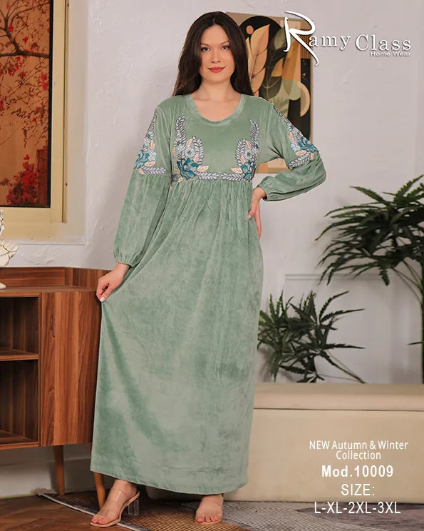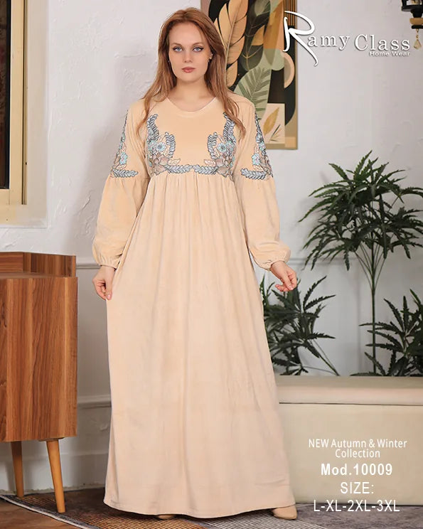 استمتعي بالراحة والأناقة في منزلك مع عباءة Ramy Class Home Wear، موديل 10009. مصممة من قماش المخمل الفاخر الذي يوفر الدفء والنعومة في ليالي الشتاء الباردة. تتميز العباءة بتطريزات أنيقة على الصدر والأكمام، مع قصة واسعة ومريحة. متوفرة بألوان جذابة مثل البيج والوردي والرمادي، ومقاسات من L إلى 3XL، مما يجعلها مثالية للارتداء اليومي أو لاستقبال الضيوف.