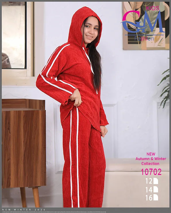 طقم شتوي بناتي أنيق من GM Kids، هودي بكابتشو وبنطلون واسع من القطيفة الناعمة بتصميم مريح ودافئ. مثالي للمنزل والخروج اليومي في الشتاء، متوفر بمقاسات 12 – 14 – 16 سنة وألوان عصرية تناسب كل الأذواق.