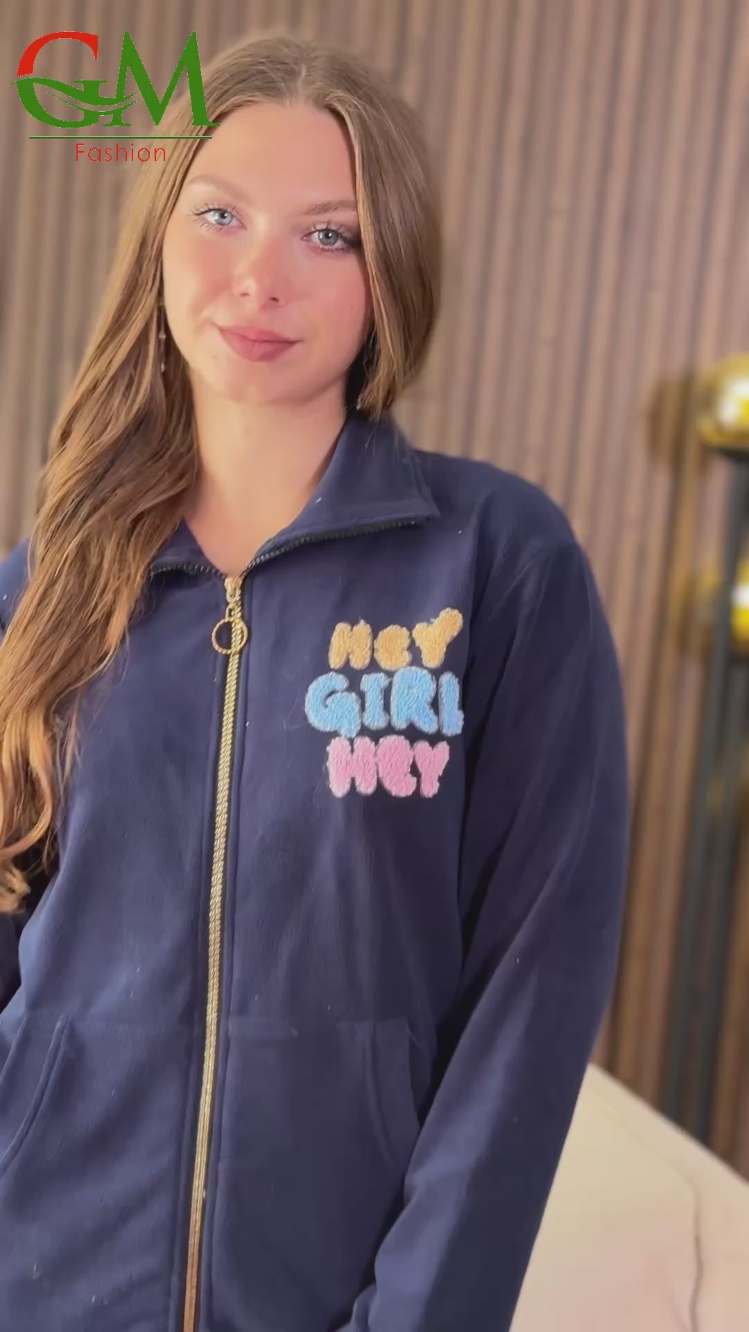 بيجامة حريمي قطيفة مطرزة GM Fashion | موديل 10421 بجاكيت شتوي وسوستة